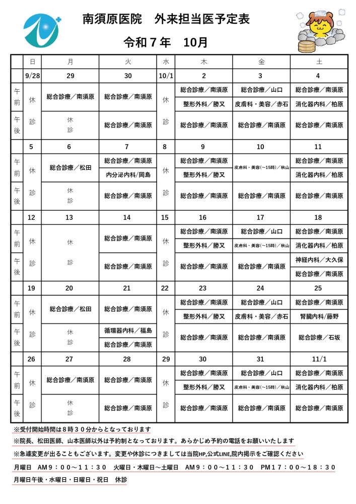 令和7年10月 外来担当医予定表